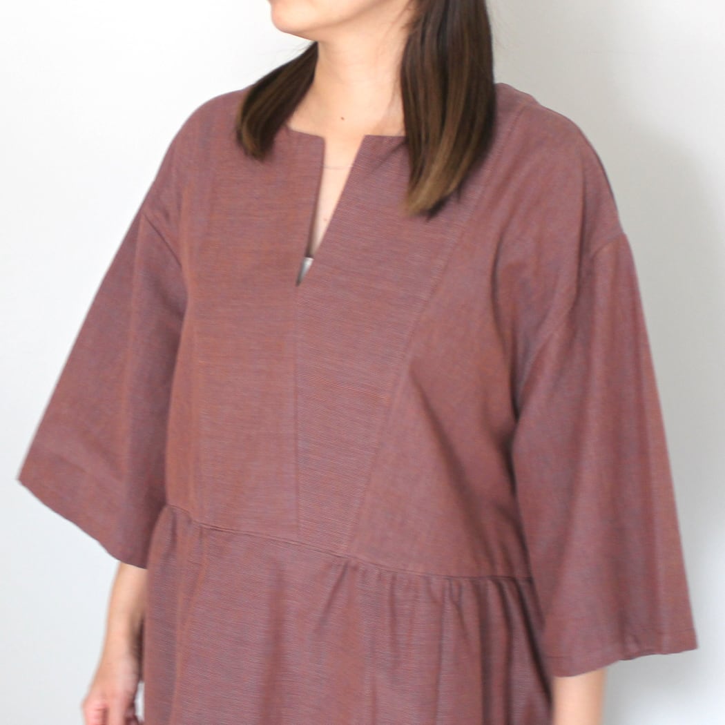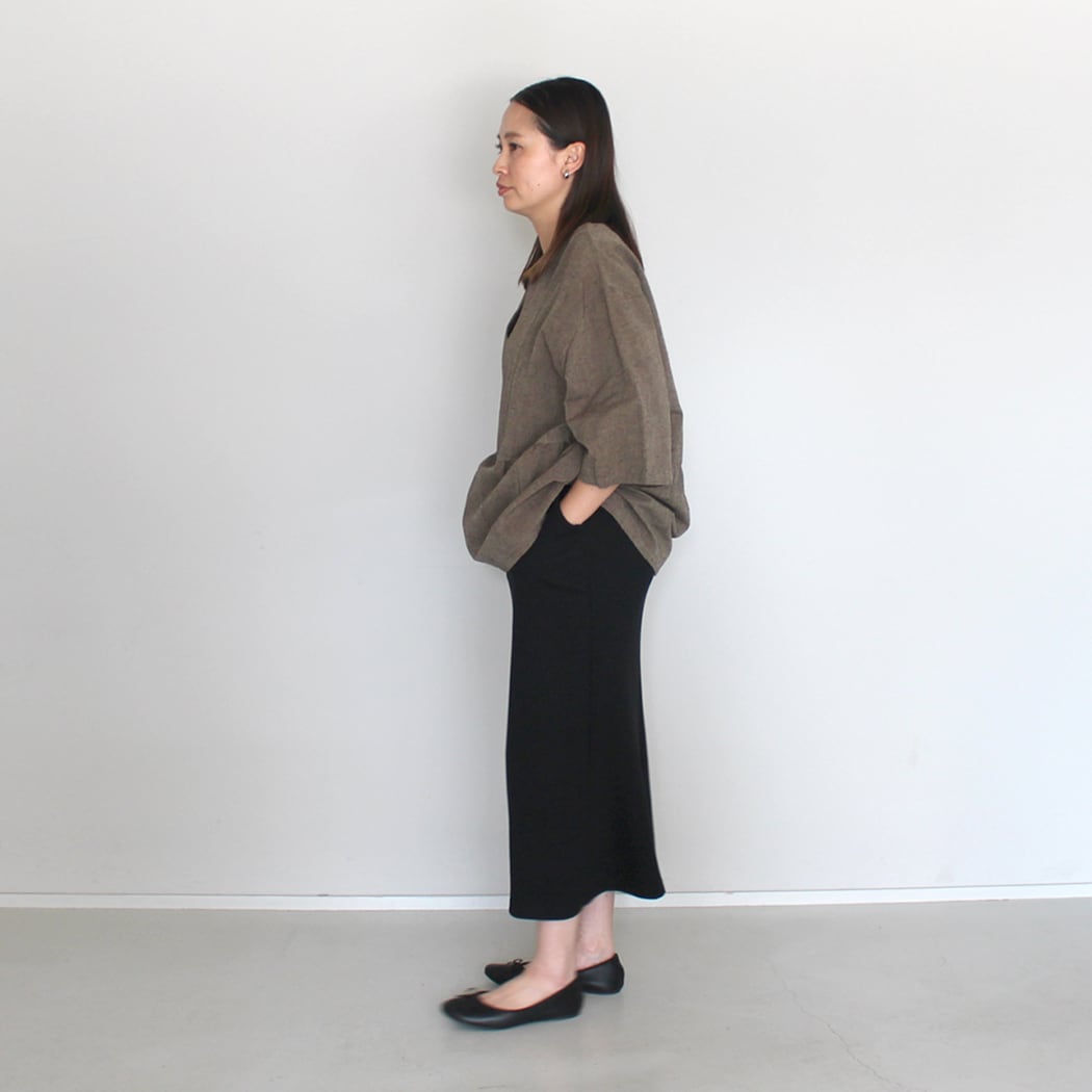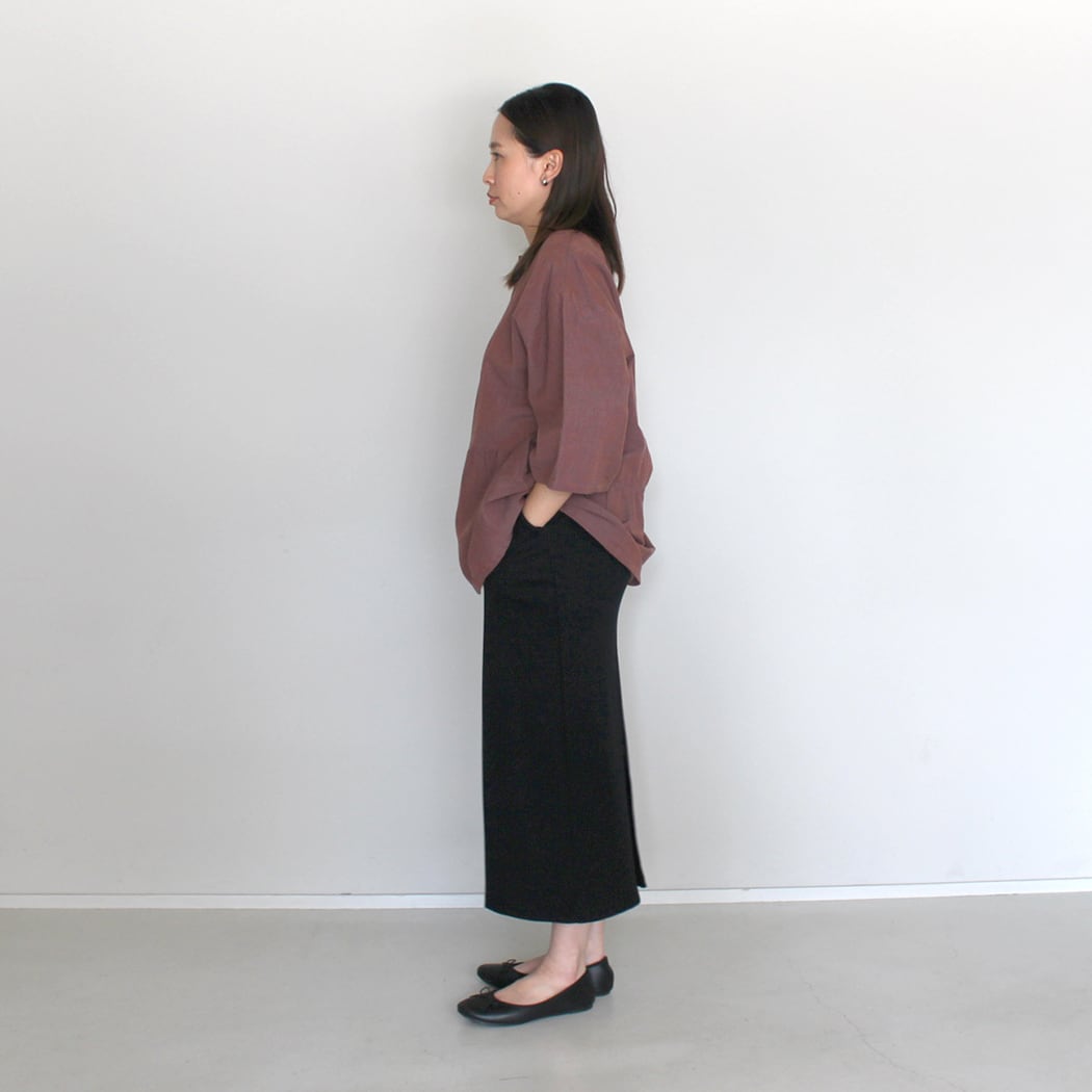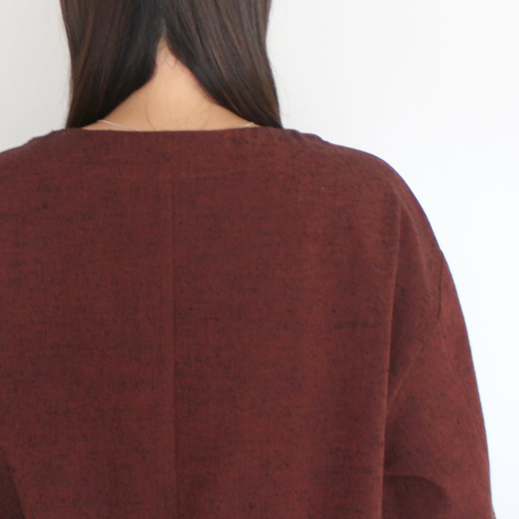 久留米絣の中でも無地の生地を使用していますので、年齢・場所関係なく幅広く活躍するアイテムです。生地は1年中使える生地ですので残暑の時期でも秋冬カラーを楽しみながらさらっと着用できます。本格的に寒くなってきたらインナーにセーターなどをレイヤードしてのコーディネートも◎