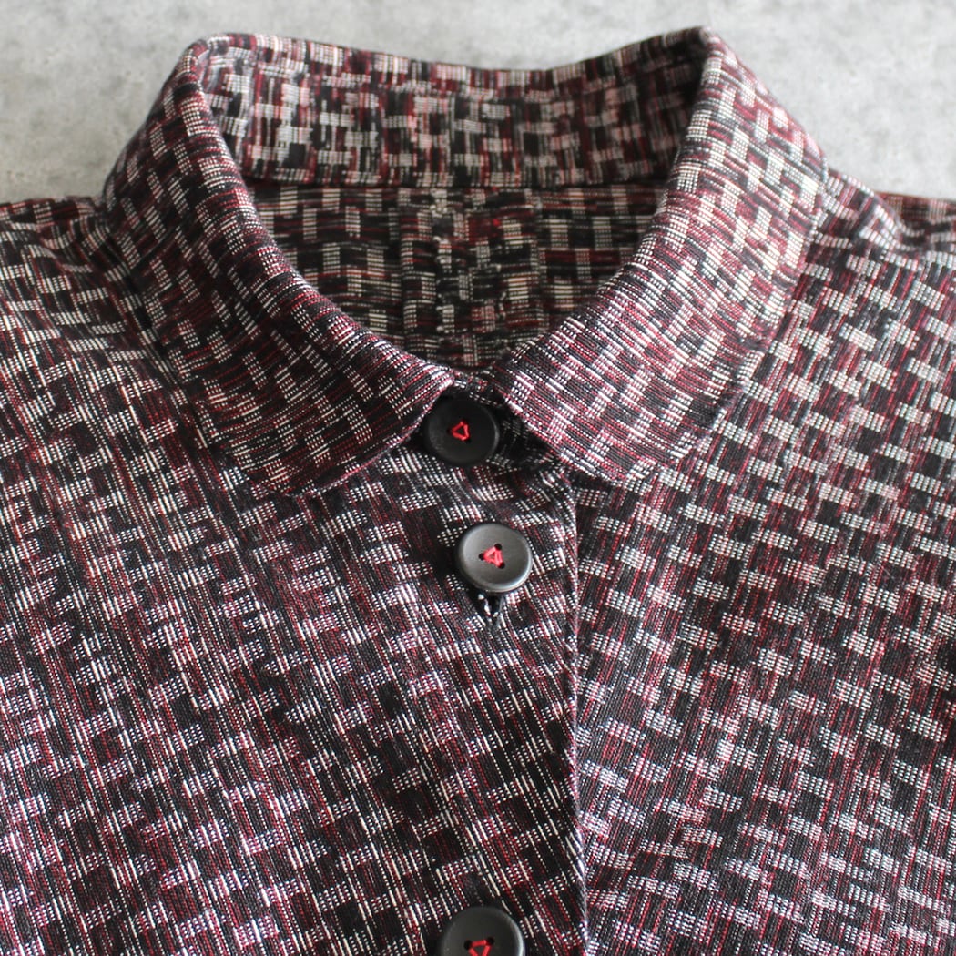 糸の色が混ざり合い、見る角度によって見え方が異なり、立体感がでて、見れば見るほど魅力的な生地です。特にこの括り糸は染まり方が均一ではないからこそ、生地として出てくる際に同じ風合いがないのも大きな特徴です。華やかなマーブル模様の中に細かいアラレ柄が入っており絣の技術も入っている贅沢な生地です。