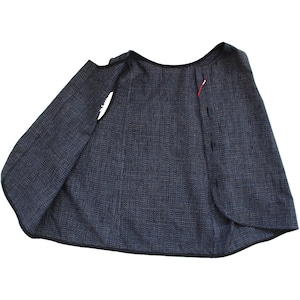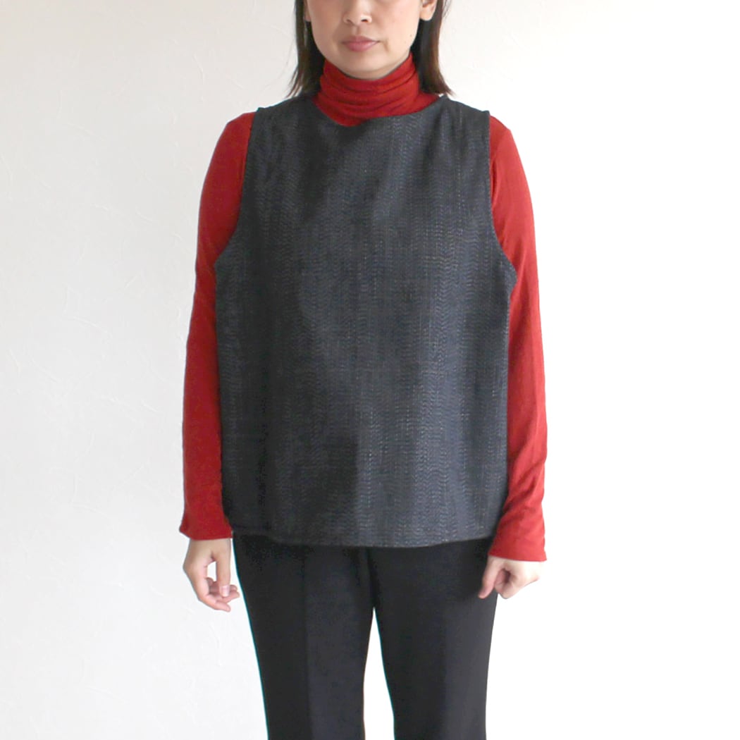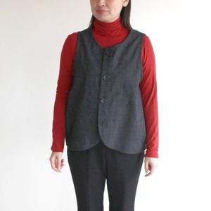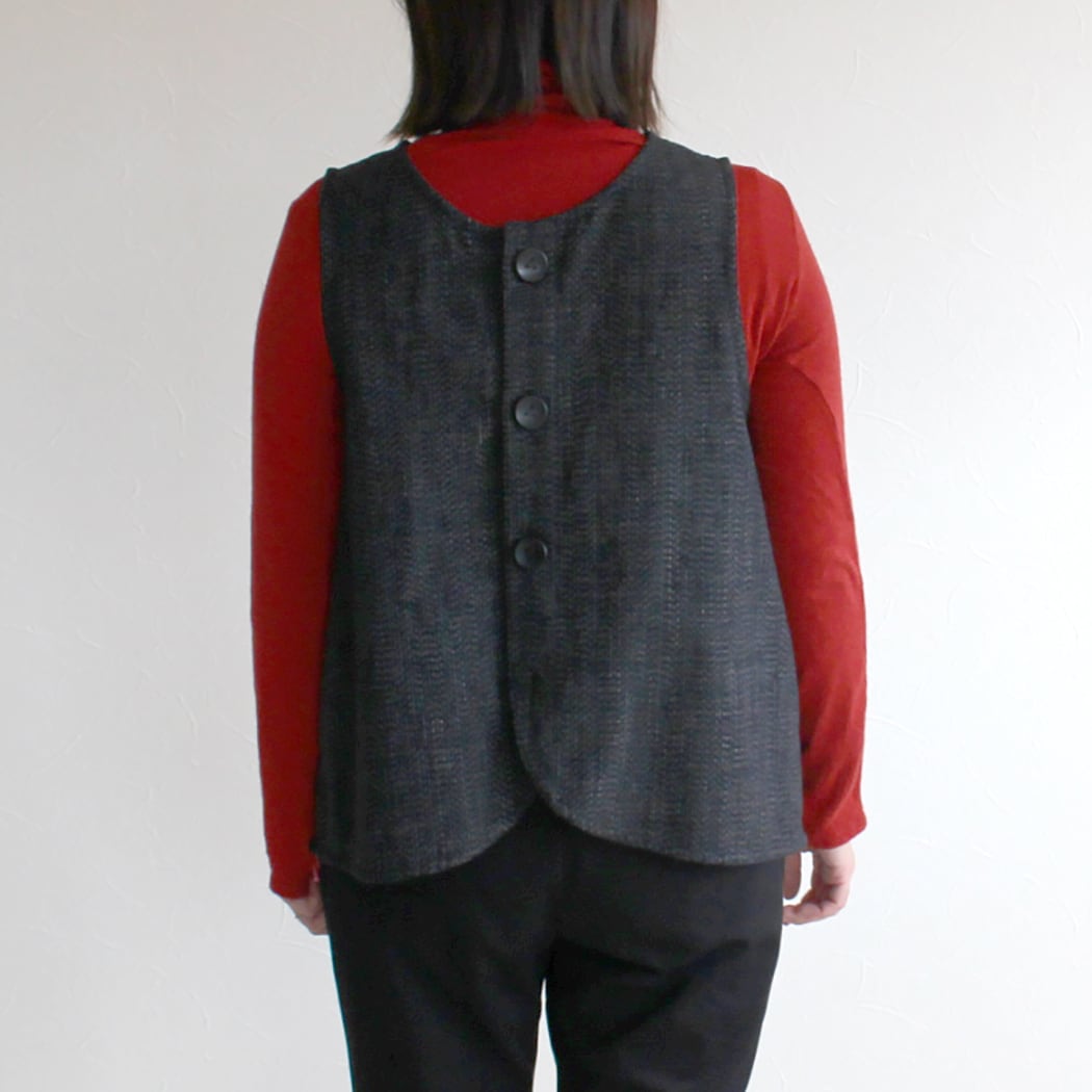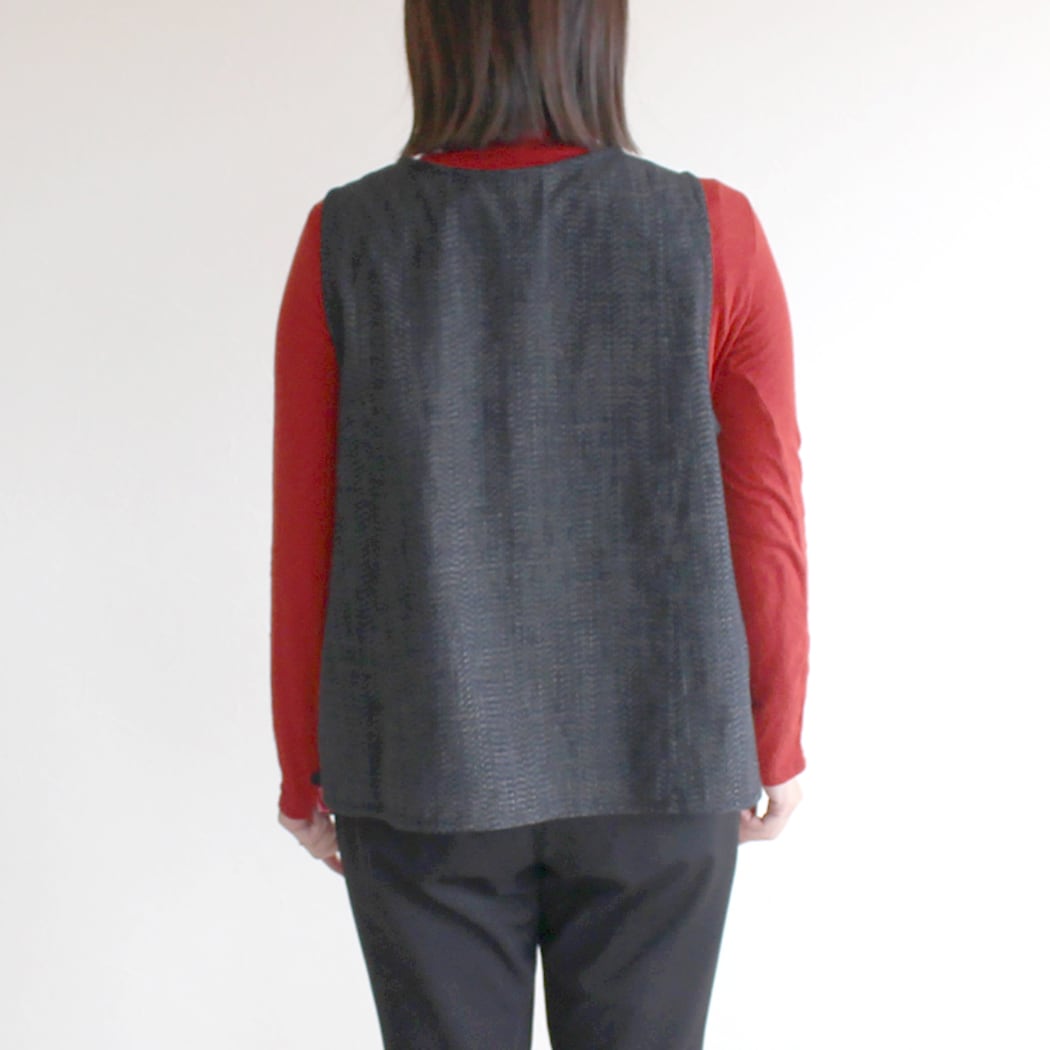 こちらのベストは、4WAYで使用可能なデザインが魅力です。前後、裏にして前後、逆にして4通り着用でき、様々なスタイリングが楽しめます。カジュアルなデイリースタイルから、特別な日のワンポイントまで、あらゆるシーンで活躍。三つ穴の木釦がさりげなくアクセントになり、シンプルでありながら洗練された装いを演出します。