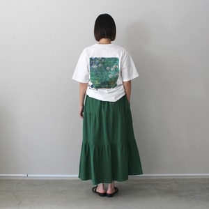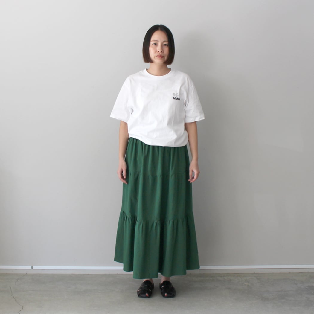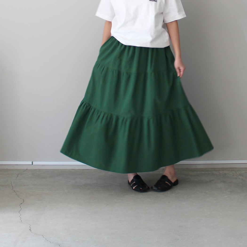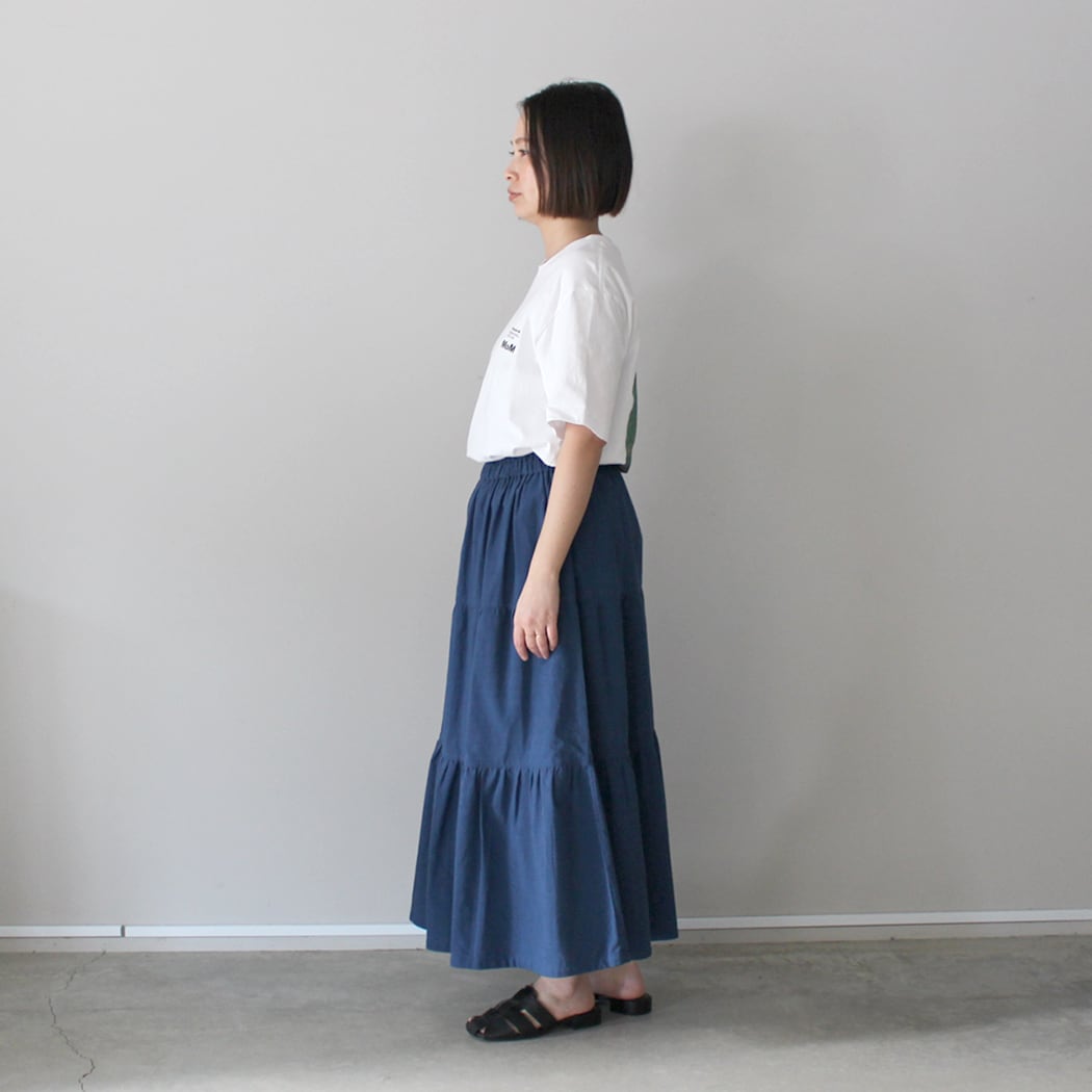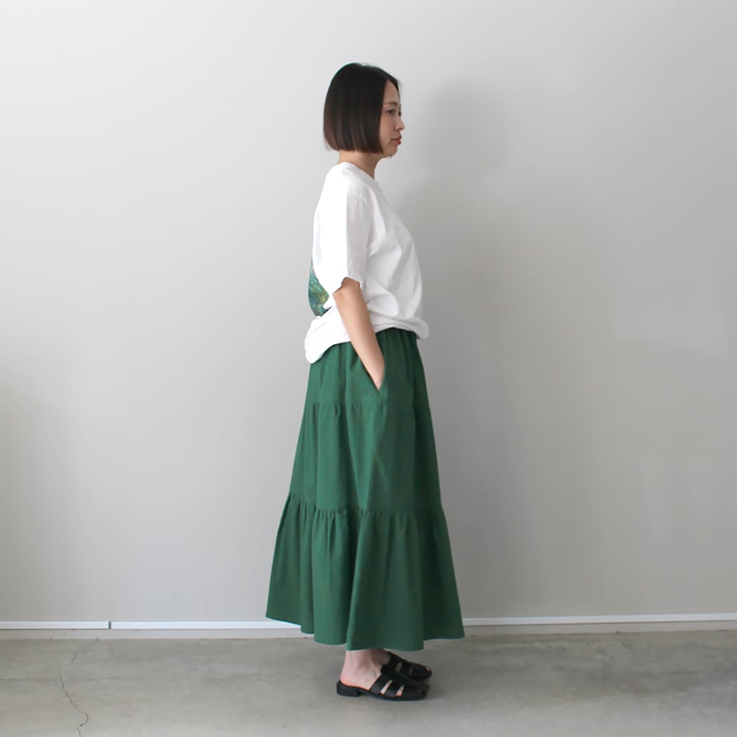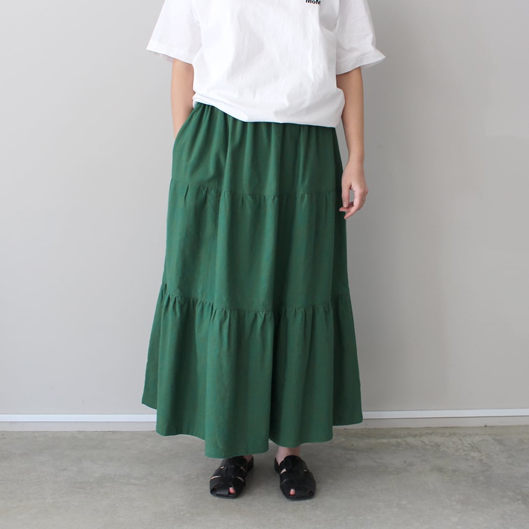 ティアードデザインは、動くたびにふんわりとしたシルエットを生み出し、女性らしさをさらに引き立てます。また、右側には便利なポケットが付いていて、デザイン性と実用性を両立しています。ウエストゴムを使用しているため、着脱も楽チンで、リラックスした着心地を実現しています。