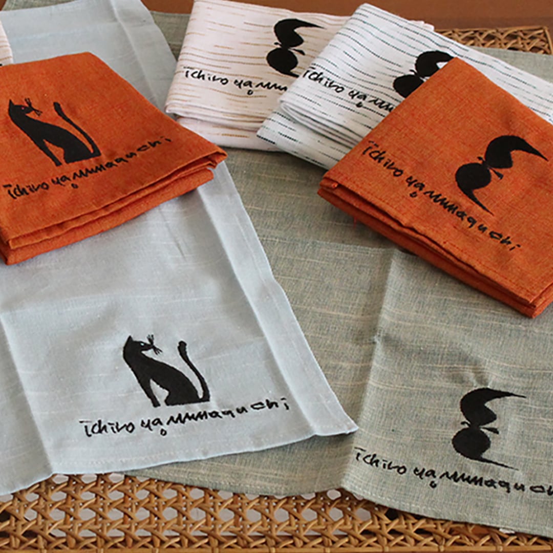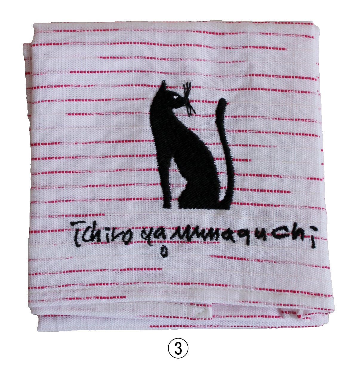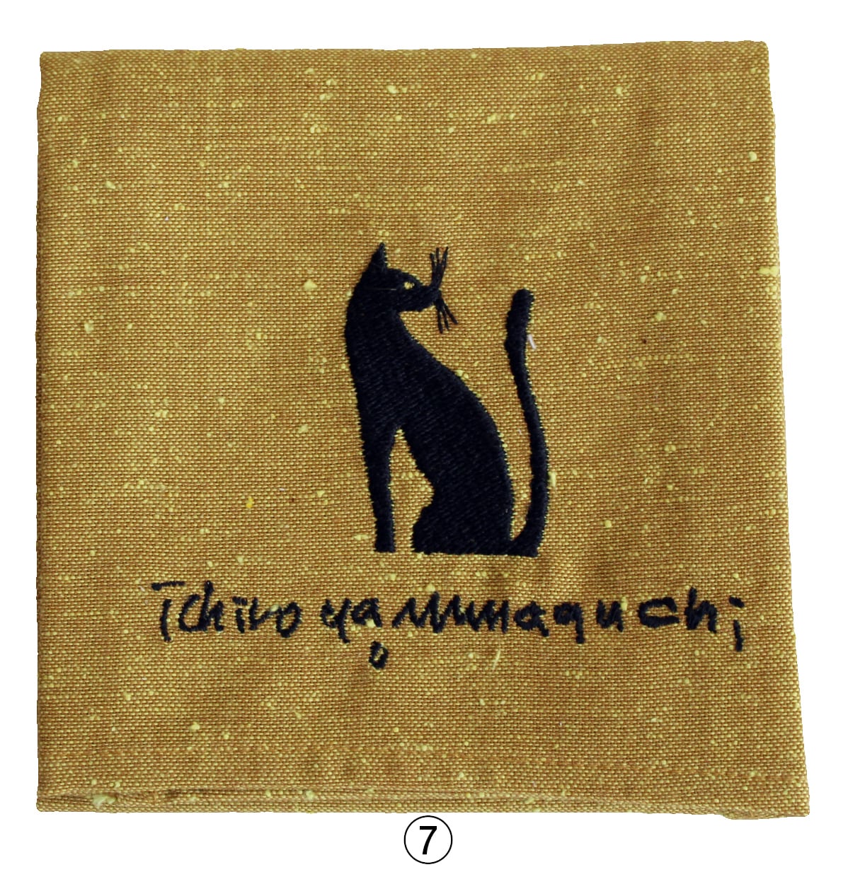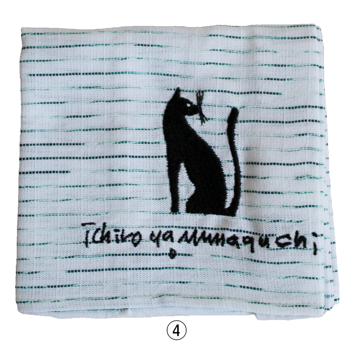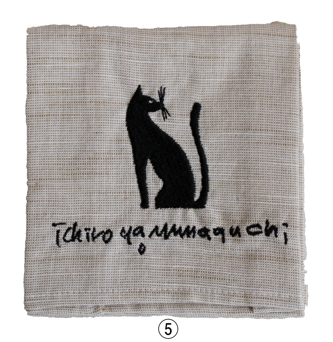 こちらは、山口さんの猫の絵とサインを絣(かすり)のハンカチに刺繍しております。