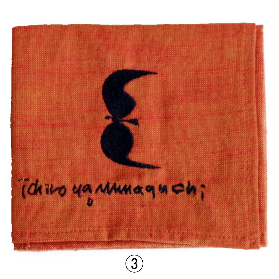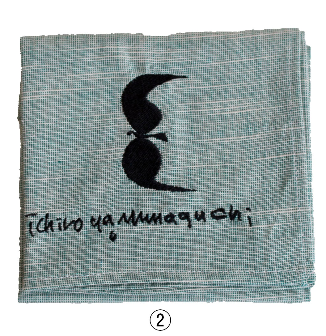 こちらは、山口さんの鳥の絵とサインを絣(かすり)のハンカチに刺繍しております。
