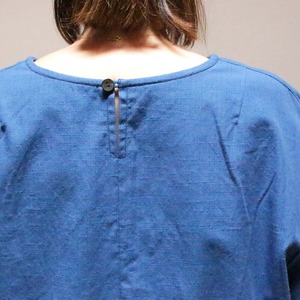 前開きなし・後ろ開き首元一か所/肩幅広めドロップショルダー/スリットなし/ポケットなし