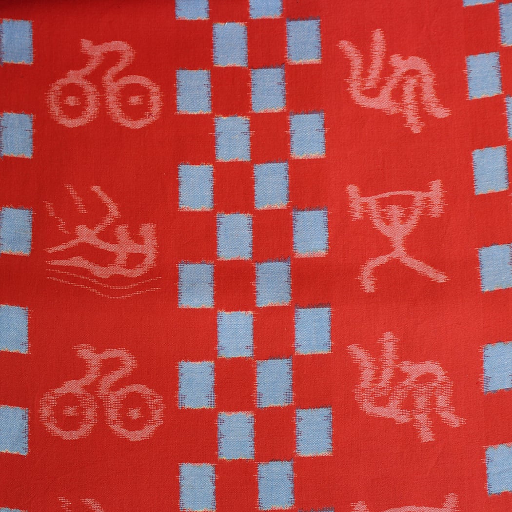 オリンピックを彷彿させる生地。アスリート達の情熱を感じる赤に重量上げや柔道、競輪などのアイコンを織り上げた楽しい柄です。