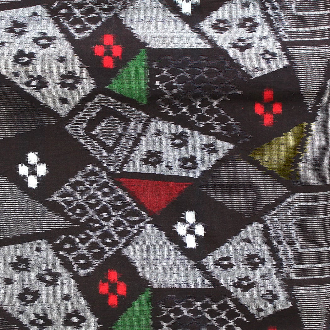 絣の柄には、花や植物など四季を感じる身近なモチーフ柄のほかにも、画像のように円や三角、四角などの模様を組み合わせた幾何学的な模様の生地もつくっています。これらは、図形の大きさや配色の組み合わせで素朴にもモダンな印象にもなり、かすり独特のズレやかすれ具合によって奥行きが生じプリントとは違った風合いが生まれます。