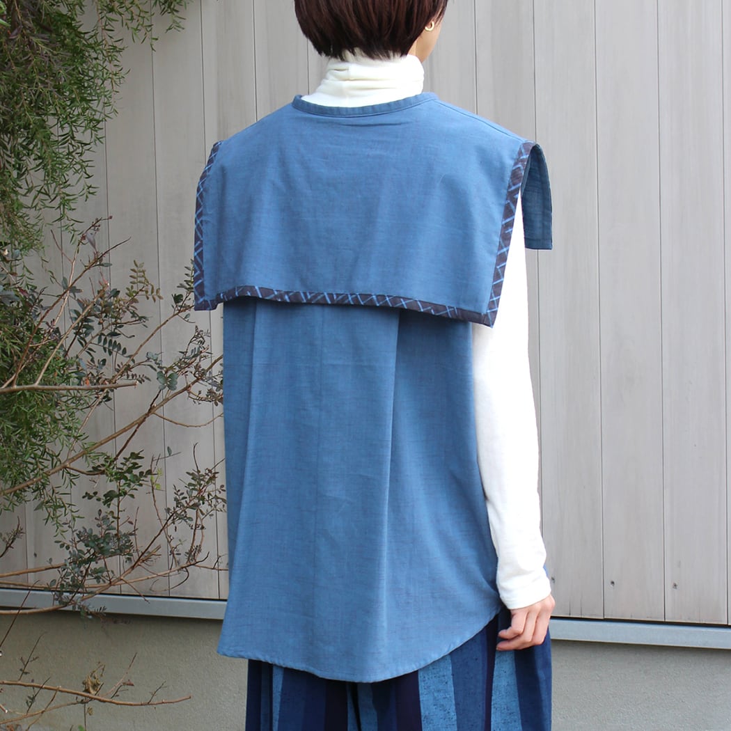 ノースリーブなのでインナーを選ばず楽しめます。季節を問わず着用でき、前開きにもできるので2WAY仕様でベストとしての着用も可能です。